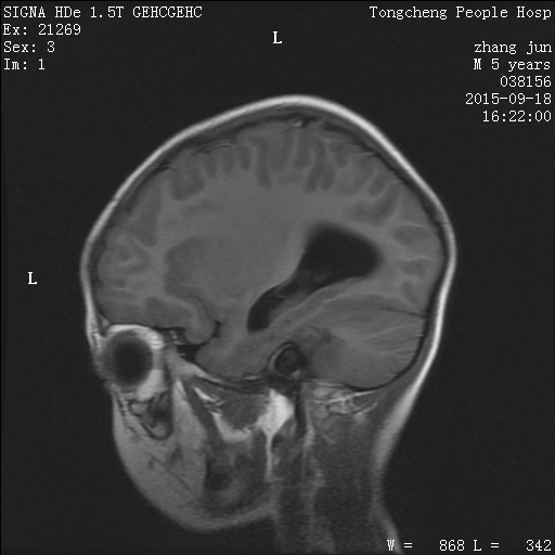 男,6岁。呕吐4天。 PE:心肺查体未见异常,腹部平软,未及包块,肠鸣音正常。 临床诊断:呕吐原因待查。 今行头部MR扫描,图像如下: