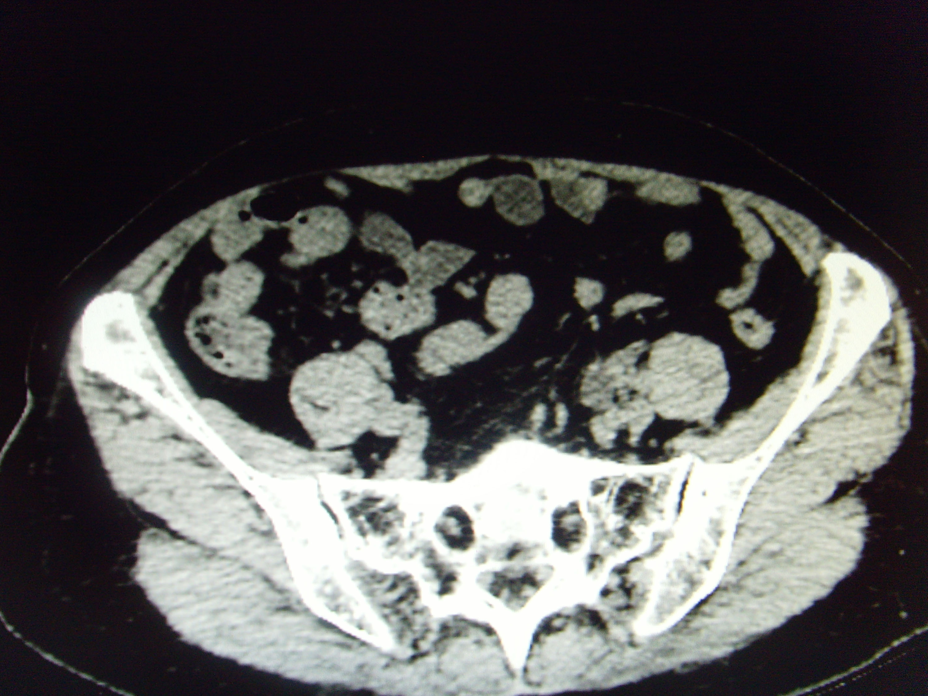 1)考虑左侧卵巢囊腺癌累及邻近结构。2)左侧输尿管下段扩张。