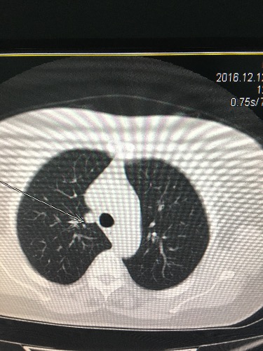 右上肺主支气管旁可见结节。考虑:右上肺占位可疑。建议增强。