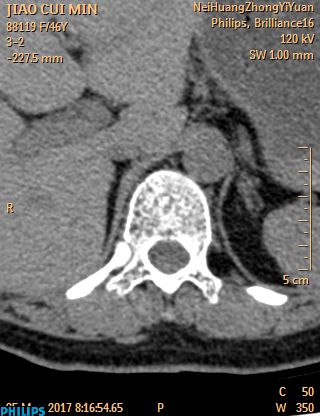 右肾上腺区可见软组织密度结节。密度较均匀,边缘清楚,中度强化,考虑:右肾上腺腺瘤。