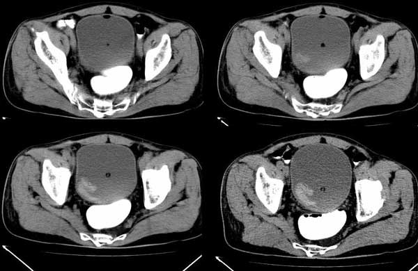 | m/76 患者于2个多月前无明显诱因出现解肉眼血尿,为淡暗红色,无尿急、尿痛、脓尿,自服中草药后症状缓解 膀胱内高密度ct值约62hu ![]() ![]() ![]() ![]() ![]() ![]() ![]() ![]() ![]() ![]() ![]() ![]() 东北发言: 首先考虑膀胱癌 cmg 发言: 膀胱内偏右后方附壁见不规则软组织密度块影,边缘有分叶,综合患者症状考虑膀胱癌。 ctboy2005 发言: 病人左肾有问题吗?肾皮质看上去很厚! 本人首先考虑膀胱内血凝块!跟踪临床经膀胱镜检查证实,但另有发现:膀胱冲洗血凝块后发现右侧壁见菜花样物质。 结果: 患者行膀胱镜检查,将血块冲洗后发现有菜花样物质! 当时完全被血块掩盖了! 今天下午病理出来了,是膀胱移行细胞癌。 病例来源: ct1360。由ctboy2005发布: http://www.radinet.com.cn/forum_view.asp?forum_id=4&view_id=3910 |