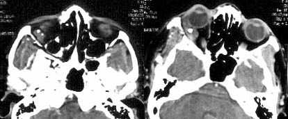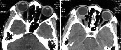 ct平扫,右眶内右下象限、外直肌外见团块状肿物,内散在结节状钙化。