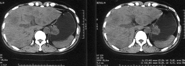 ct平扫:胃贲门部见软组织肿物突入胃腔内,大小4x3cm,浅分叶状,中央密度较低,邻近胃壁增厚。外缘与周围组织分界清。im25层面,小网膜囊区见两枚肿大淋巴结,直径均约3cm。肝脏大小正常,肝内散在分布多个大小不等的类圆形低密度影,最大者位于肝右前叶上段,直径约4cm,病灶边缘模糊,与正常肝实质分界欠清。