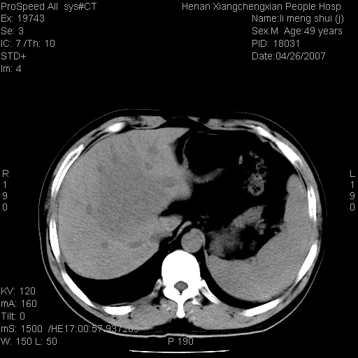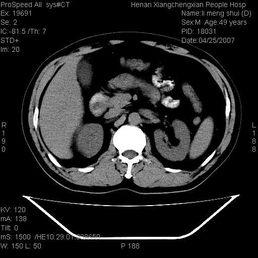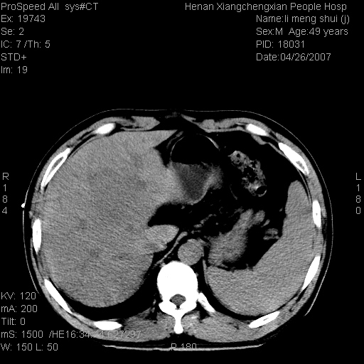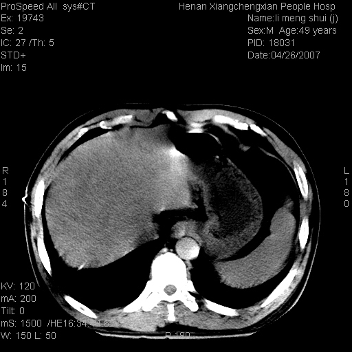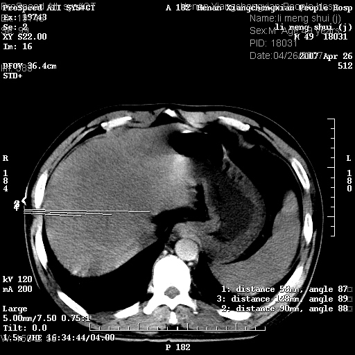 | 患者,男,49岁, 腹疼伴恶心\\呕吐20天,20天前无明显诱因出现右上腹部疼痛,钝疼,无放射,伴恶心\\呕吐,不伴发热.患者不愿增强. b超:肝脏右叶实性占位. ct:肝脏右叶可见一巨块状圆形低密度影,大小约93mm*84mm,其内可见点状高密度影,胆囊、胰腺、脾脏大小、形态及密度未见异常,腹膜后间隙未见肿大淋巴结影。 印象:肝脏右叶巨大肿块,性质待定,建议增强并穿刺活检进一步确诊。 ct平扫: ![]() ![]() ![]() ![]() ![]() ![]() ![]() ![]() ![]() ![]() ![]() ![]() ![]() ![]() ![]() ![]() ![]() 肝脏右叶肿块ct引导下穿刺活检术 患者于16时05分仰卧于ct检查台上,首先行肝脏ct扫描确定进针位置、深度、角度。在局麻下行ct引导下肝脏右叶肿块穿刺活检术。常规消毒、铺巾、局麻。在ct引导下使活检针经右侧腋中线、第9肋间隙垂直胸壁进针90mm,针头进入病变预定位置。在病变预定位置多点、多方向抽取小米样病变组织多块,涂片五张送病理检查。术后穿刺点局部无出血,未出现腹腔积液等并发症。术中及术后患者生命体征稳定,手术于17时10分成功完成。患者安返病房。 穿刺片 ![]() ![]() ![]() ![]() ![]() ![]() ![]() ![]() ![]() ![]() ![]() ![]() ![]() ![]() ![]() ![]() 病理结果肝细胞癌 ![]() 原贴地址:http://www.radinet.com.cn/forum_view.asp?forum_id=4&view_id=24130 ok |