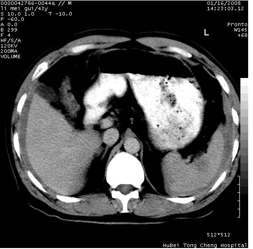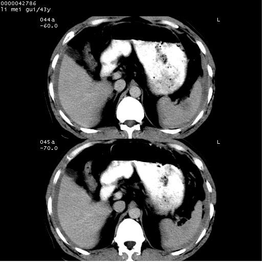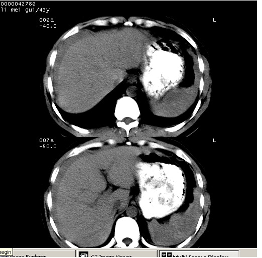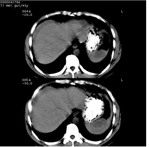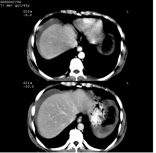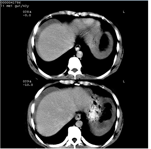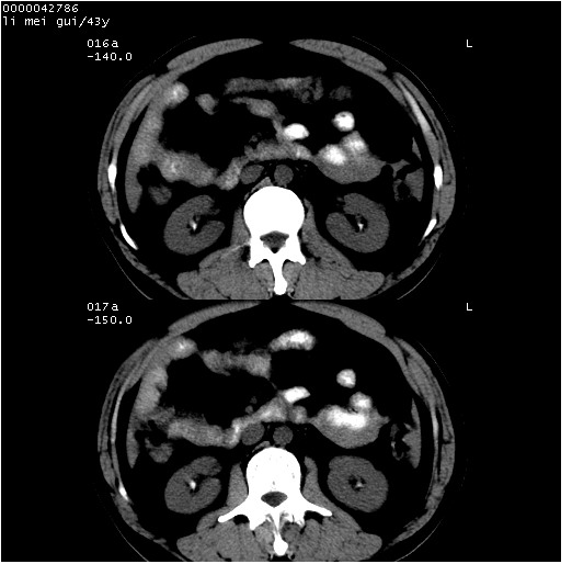 | 患者,男,43岁。突发腹痛2小时,面色苍白,难以平卧。自述近期无明确外伤史,为摩托车驾驶员。 腹部b超检查:脾脏中上极回声异常,肿瘤待排。 临床诊断:腹痛原因待查。 上中腹部ct轴位平扫+增强扫描(层厚10mm,螺距1.0,重建间隔10mm),图像如下: ![]() ![]() ![]() ![]() ![]() ![]() ![]() ![]() ![]() ![]() ![]() ![]() ![]() ![]() ![]() ![]() ![]() ![]() ![]() ![]() ![]() ![]() ![]() ![]() ![]() ![]() ![]() ![]() ![]() ![]() ![]() ![]() ![]() ![]() ![]() zrs发言:支持脾破裂 wwp发言:支持脾破裂并腹水。 xulianj发言:脾脏肿瘤破裂可能性大 zsl6918发言:不像肿瘤出血,考虑还是与外伤后引起的慢性出血有关 zzyy发言:平扫见肝周及脾周积液,脾内密度不均。脾内肿瘤较少见。还是外伤性脾破裂。 沈丘东方医院发言:脾门区一个不均匀强化病灶与其周液体相连多考虑脾占位破裂出血 yixianman001011发言:脾破裂并腹水是可以肯定的,具体原因多以肿瘤性破裂出血,脾脏淋巴瘤可能性大. 结果: 术后,经详细询问患者,其仔细回忆:一月前骑摩托时左侧腰部与别人有“轻微”触碰,因责任在自已,当时又无明显不适,未引起注意。 临床术后诊断:脾破裂并失血性休克(1.外伤性迟发性脾破裂。2.脾脏肿瘤破裂?) 术后标本病检:脾破裂并出血,未见明显肿瘤成份。 原贴地址:http://www.radinet.com.cn/forum_view.asp?forum_id=4&view_id=34070 |