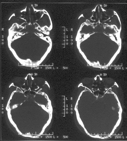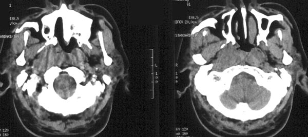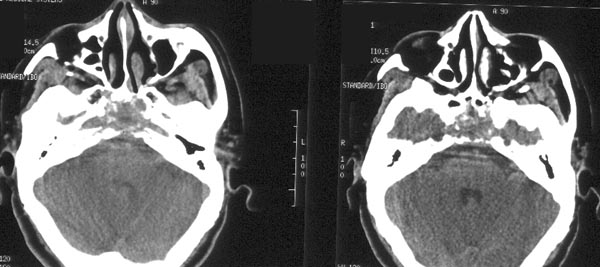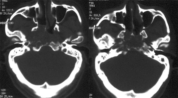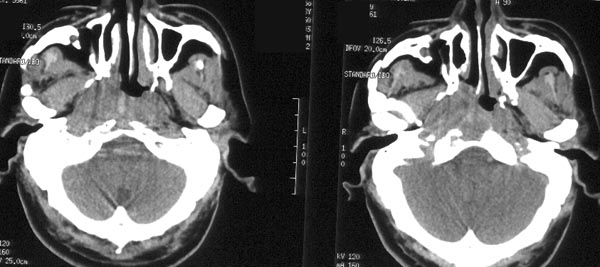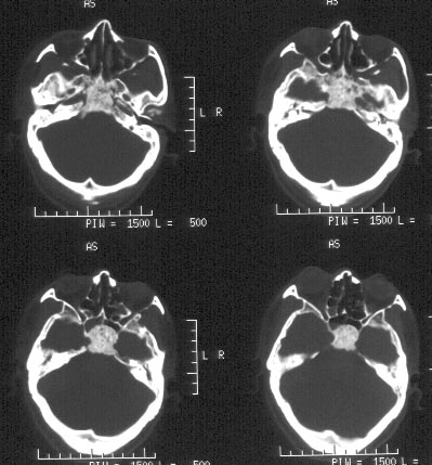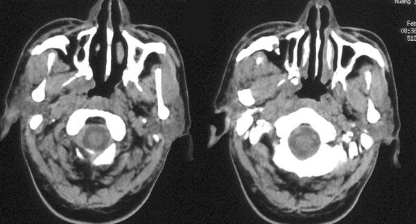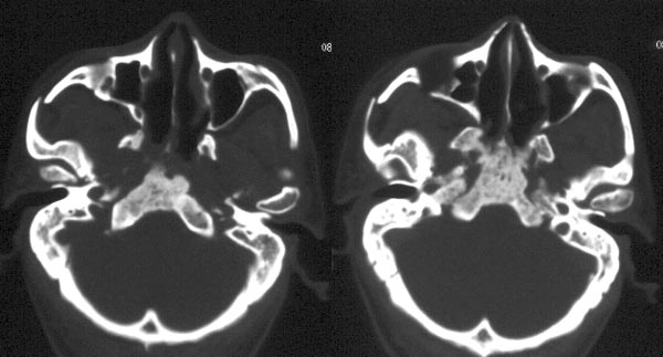男性,48岁。吸涕带血2月余。![]() ![]() ![]() ![]() ![]() ![]() ct平扫:鼻咽腔明显狭窄,鼻咽顶壁、顶后壁、后壁、双侧壁增厚,右侧甚,右侧鼻咽旁间隙、颈动脉间隙见软组织肿物占据,肿物向前达后鼻孔,向下达右侧口咽,肿物向中颅窝侵犯致广泛颅底骨质破坏:包括枕骨斜坡、枕大孔、蝶窦、鞍底、双侧蝶骨大翼、双侧岩尖、双侧翼板。蝶窦、蝶鞍为软组织肿物占据,左侧海绵窦稍增厚。左侧鼻咽旁间隙、颈动脉间隙未见明显异常。 ct诊断:考虑鼻咽癌,并口咽受侵犯、颅底骨质破坏。 患者放疗后半年ct复查 ![]() ![]() ![]() ct平扫:鼻咽右侧壁增厚,右侧咽隐窝消失,右侧咽旁间隙变窄,但病灶较原片明显缩小。原片所见鼻咽顶壁、顶后壁、后壁增厚,现已基本恢复正常,原片见枕骨斜坡、蝶骨基底部骨质破坏,现亦已修复,为高密度骨质充填。颈深筋膜各间隙未见肿大淋巴结。 ct诊断:鼻咽癌放疗后,肿物较前片明显缩小,颅底骨质破坏基本修复。 |