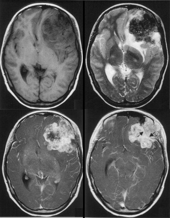女,16岁。因反复头痛5个月,癫痫发作1次,并发现左侧额部一肿块突出1个月就诊。 【sxlcbc 点评】 颅内原发性平滑肌肉瘤极为罕见,属于脑膜间质,非脑膜上皮细胞肿瘤,为新增的一类肿瘤。其诊断主要靠免疫组织化学,sm-actin表达均为阳性。影像学表现:常呈较大软组织肿块,边界大多清楚.部分呈浸润生长者,边界不清,其内mri信号不均,多有囊变、坏死,偶有出血、钙化;增强后常可有边缘性环状强化。本例病变平滑肌肉瘤部分与正常脑组织分界亦较清楚,边缘仅有轻度水肿,肿瘤信号不均,增强后呈明显不均匀强化,内可见片状无强化区。考虑为肿瘤坏死所致。 原发于颅内间叶性软骨肉瘤亦相当少见,是一种缓慢生长的局部侵犯性肿瘤,好发于颅底,易于压迫和侵犯穿行于颅底的颅神经。颅骨软骨肉瘤生长缓慢,初期症状不明显,故体积常较大,主要向颅内生长,可压迫、推移或浸润邻近脑结构,mr t1wi上呈低、等信号;透明软骨型t2wi上为高信号,但如果含有较多的矿物质则为低信号,无论那种软骨肿瘤中央常为低信号,增强后肿瘤呈不均一强化,较一般脑内实质性肿瘤强化显著。本例中软骨肉瘤部分亦位于前颅窝底,t1wi呈等低混杂信号,t2 wi亦呈低信号,增强后呈中度不均匀强化。 颅内原发性平滑肌肉瘤及原发软骨肉瘤均为罕见肿瘤,需要鉴别的有恶性脑膜瘤,恶性脑膜瘤亦表现为信号不均匀、不均匀强化、囊变、坏死、肿瘤外形不规则,但常有明显的瘤周水肿。另外需要注意的是,仔细观察在个别层面可以看到两种不同成分肿瘤间有一线样低信号分隔,及分隔线内外强化模式不同,此时也应想到两种肿瘤共存的可能性。与多数脑膜来源的恶性肿瘤一样,虽然mr检查特征性改变较少,但可以确定肿瘤的发病部位、大小、范围、生长方式、与周围结构的关系,对确定肿瘤的良恶性,以及有无远处转移、局部浸润等很有价值,对肿瘤治疗方案的制定亦有一定的指导意义。 |